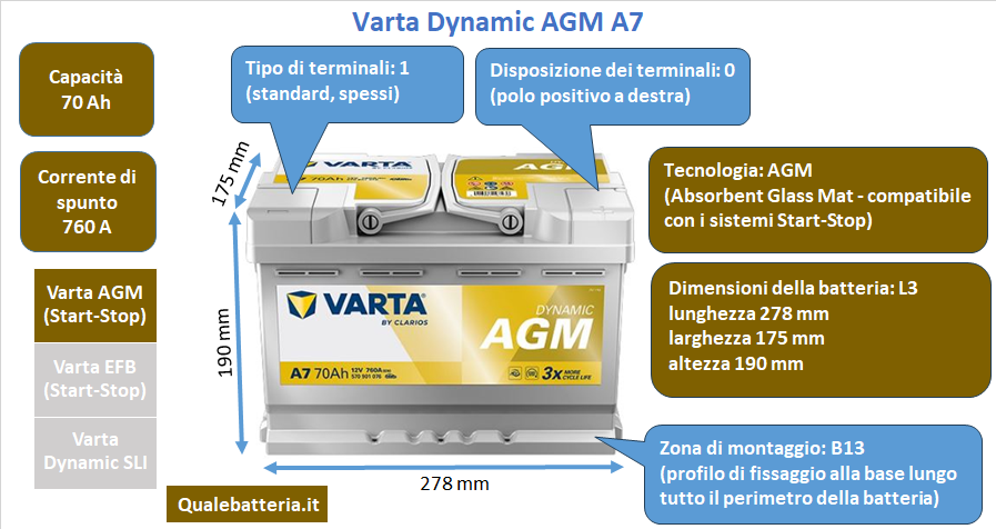 | Varta Silver Dynamic AGM | A7 | 70 Ah | 760 A | 278x175x190 mm | B13 | Più |