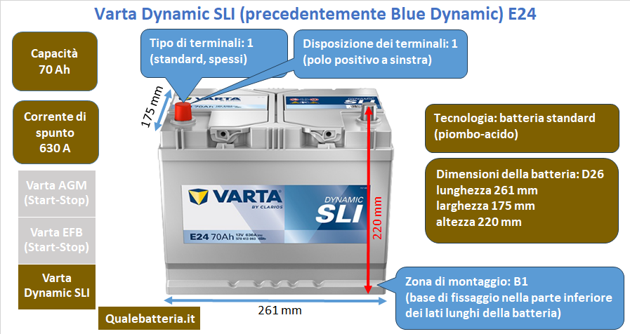 | Varta Blue Dynamic | E24 | 70 Ah | 630 A | 261x175x220 mm | B01 | Più |